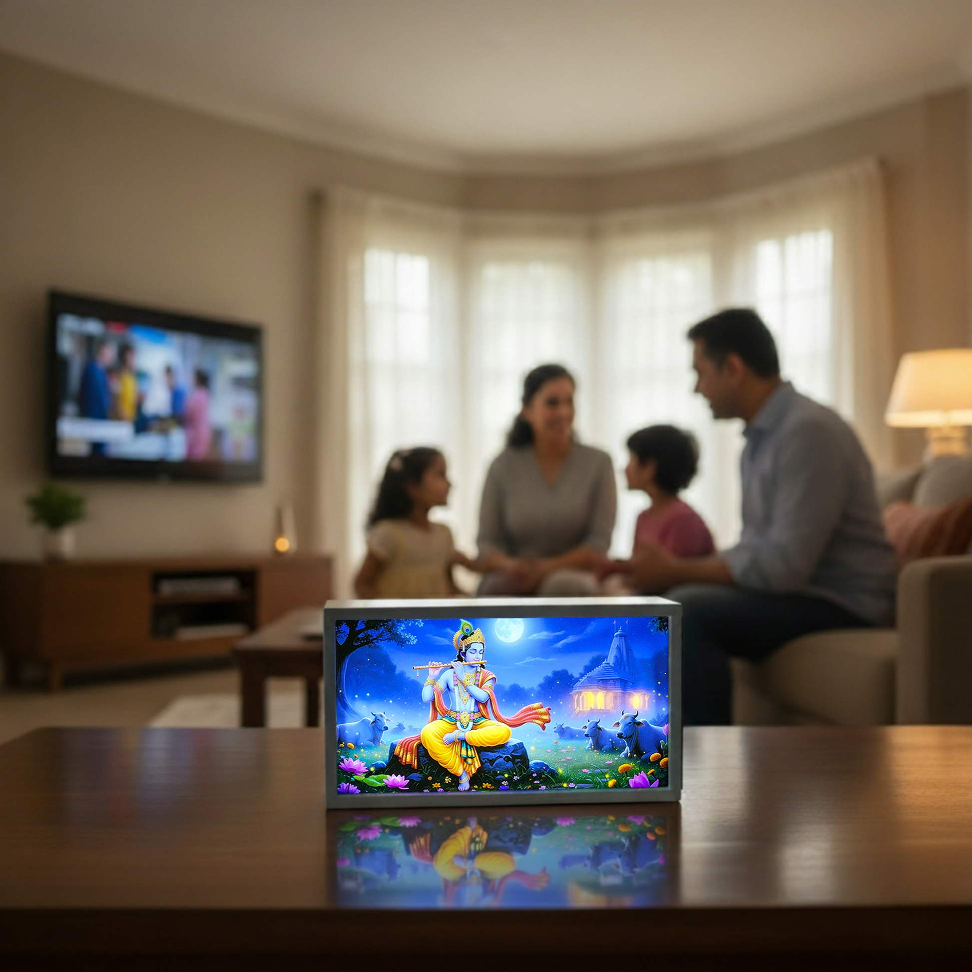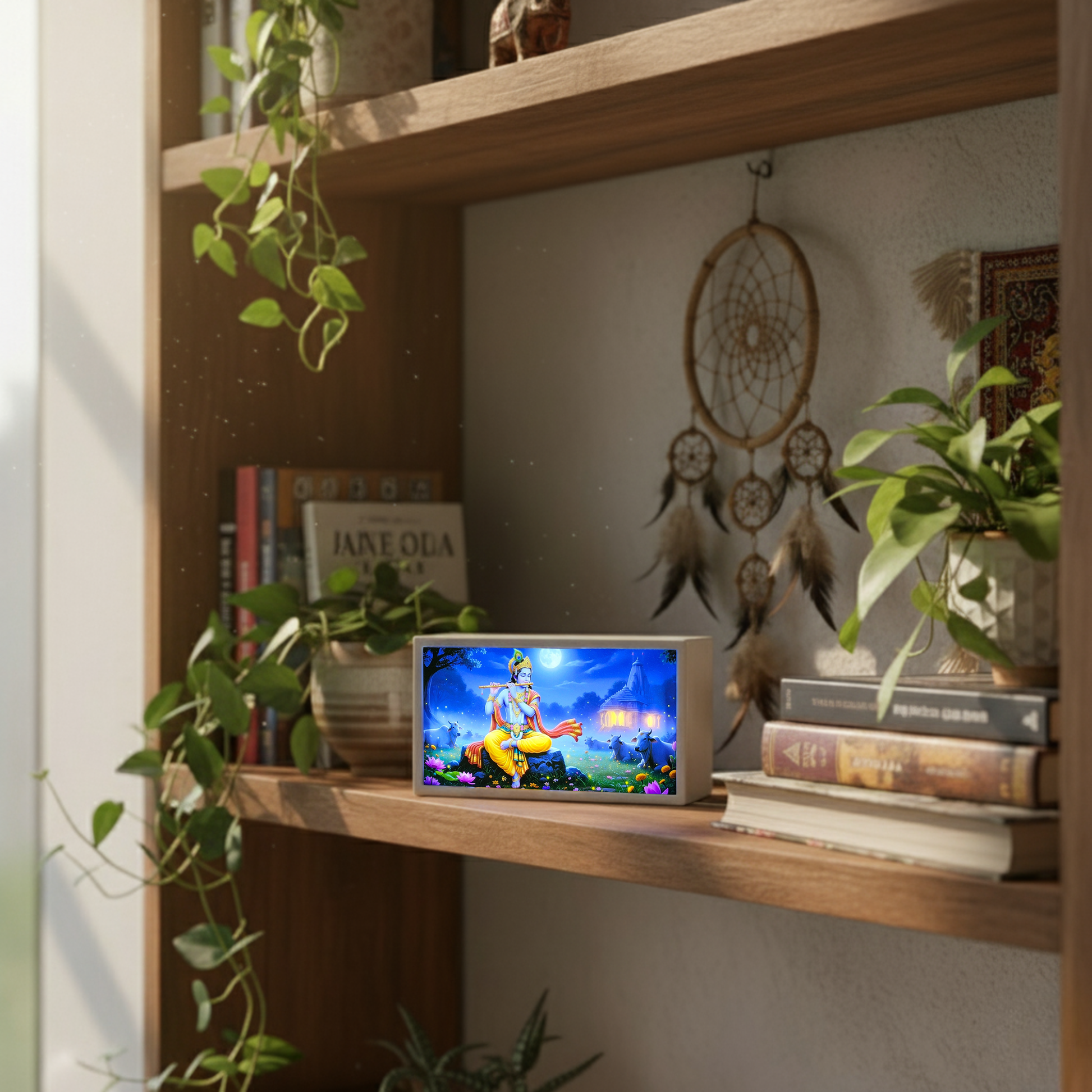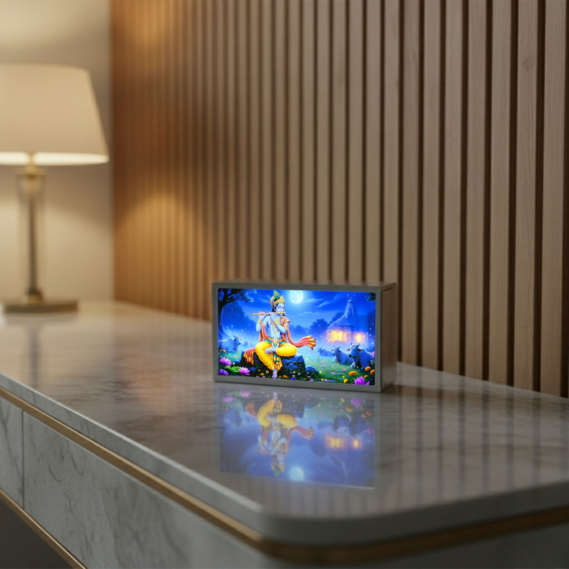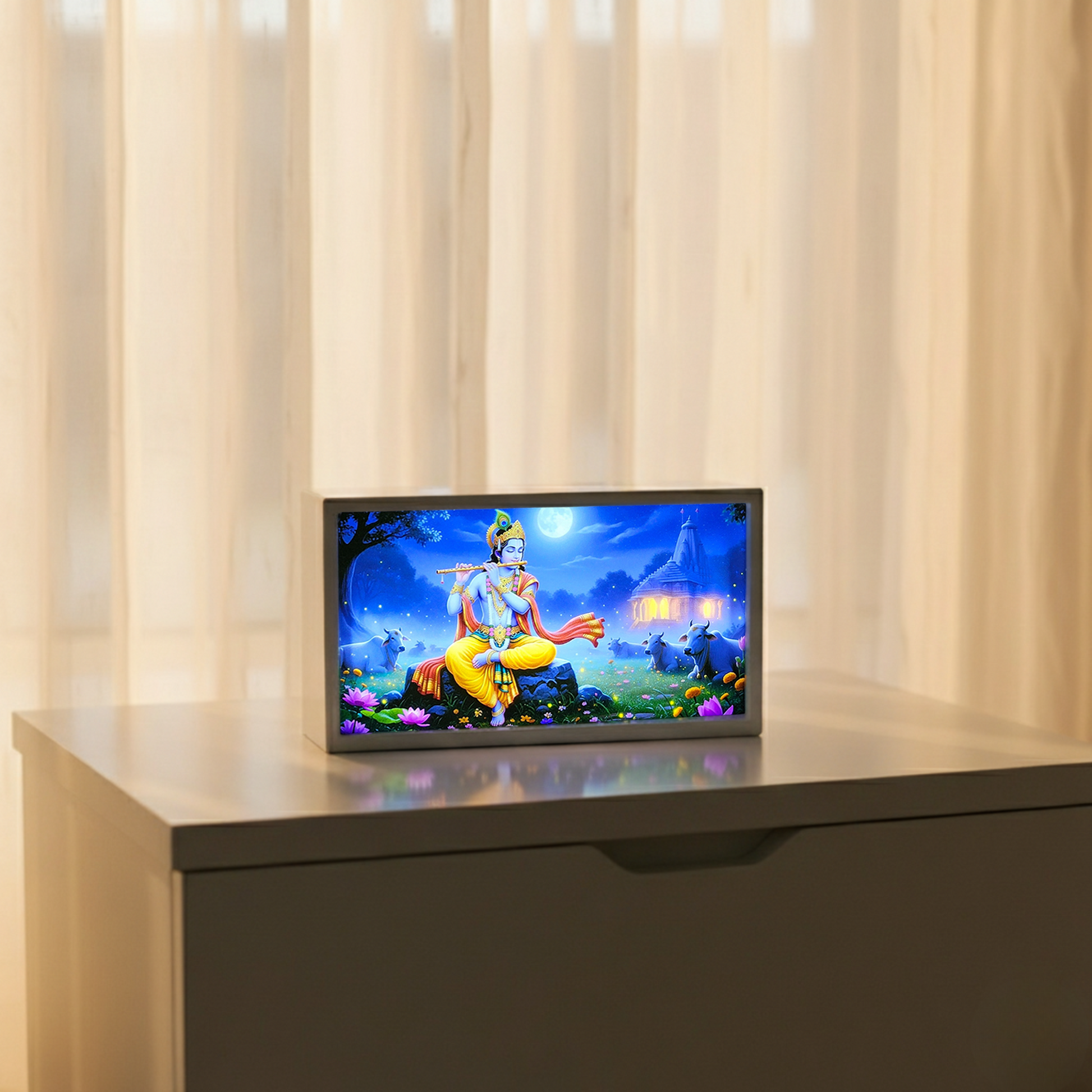 A compact Krishna light box that adds a touch of devotion and calm to your space perfect for side tables, consoles, or modern interiors with a peaceful vibe.
