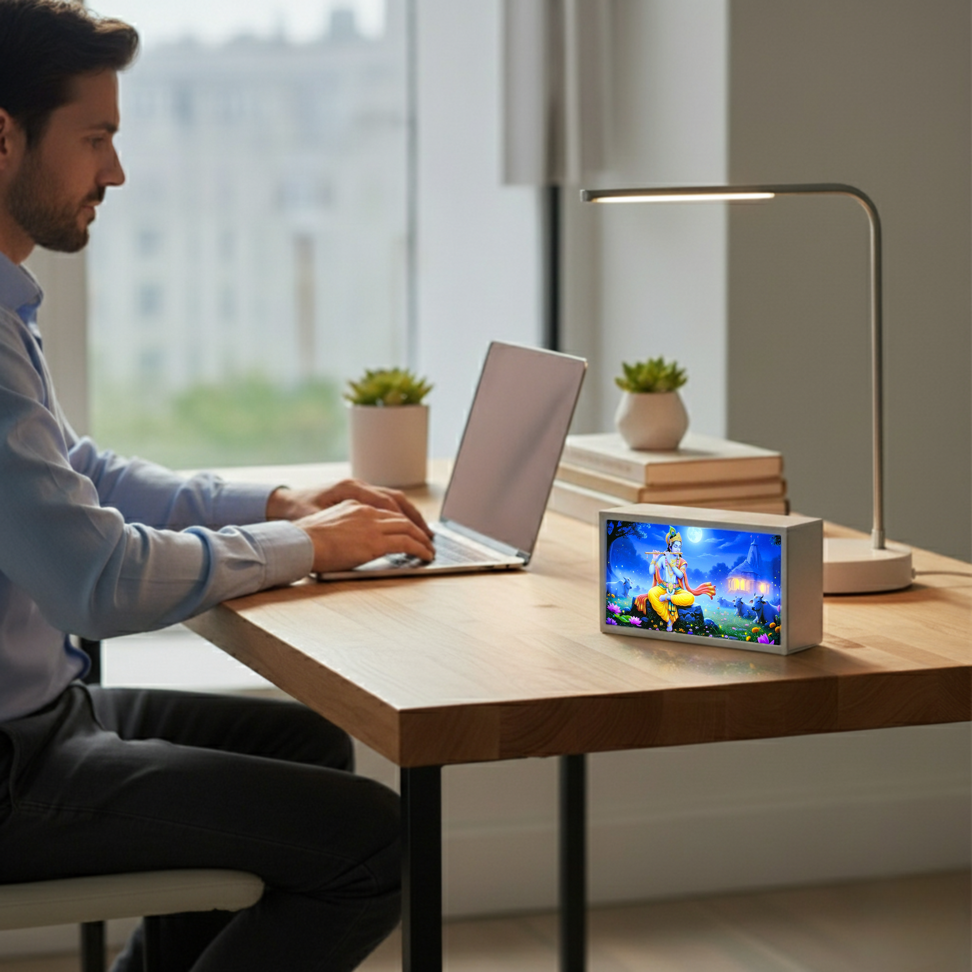 A gentle glow of Lord Krishna on your desk brings peace, clarity, and positive energy perfect for staying calm and focused during long work hours.