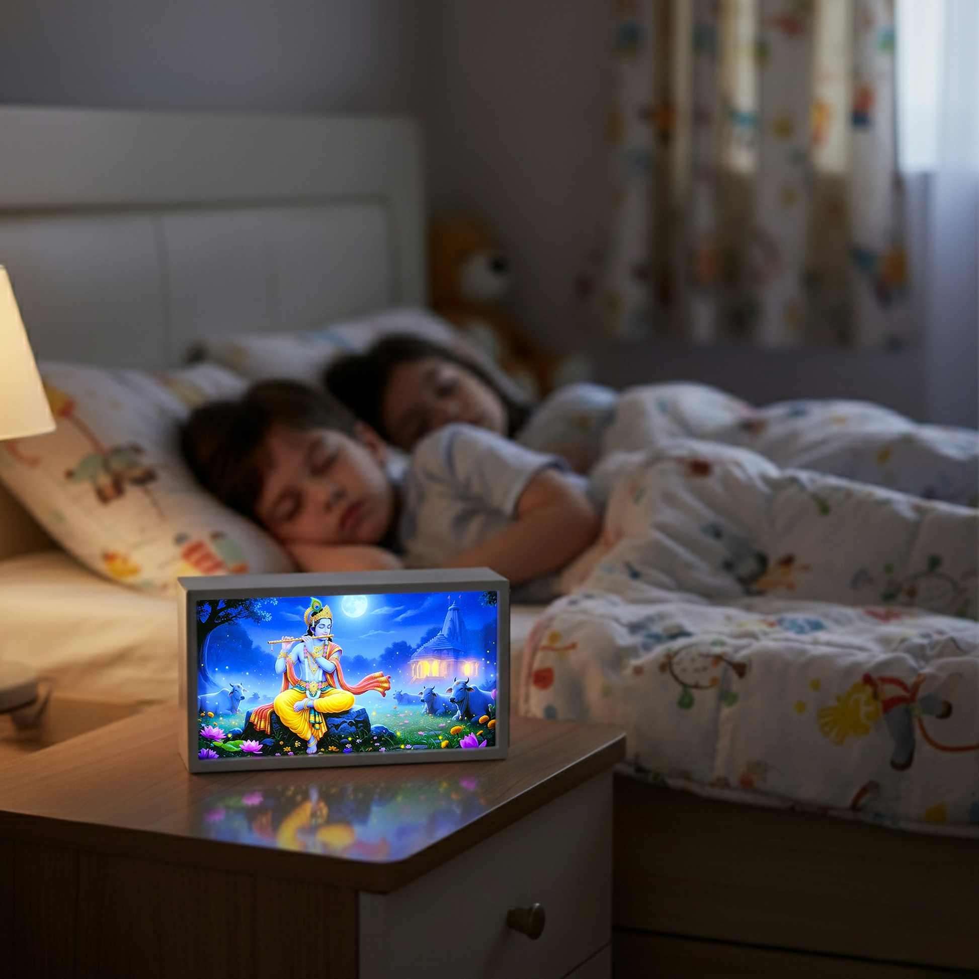 A soft Krishna glow by the bedside brings calm, comfort, and a sense of divine protection helping create a peaceful sleep environment for your loved ones.
