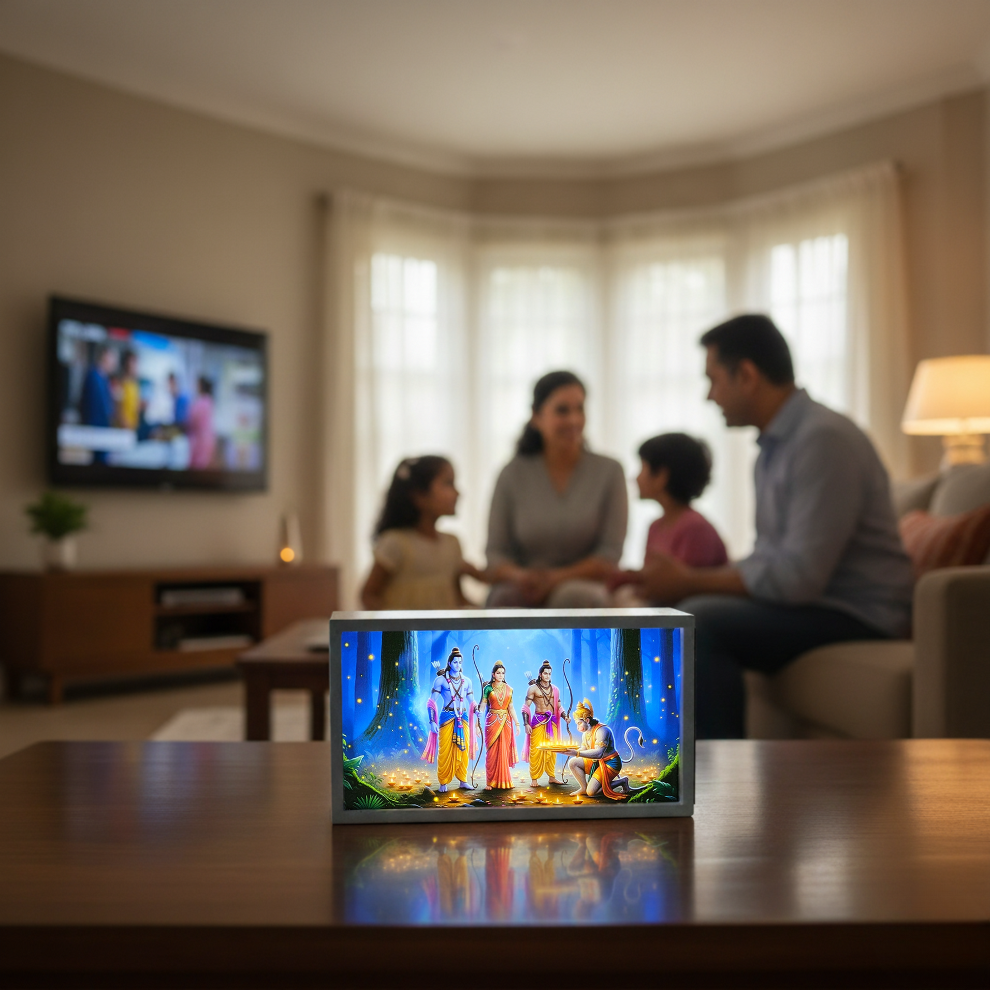 🏹 A calming LED lamp showcasing Ram ji, Sita Mata, Laxman ji and Hanuman ji—ideal for meditation, prayer, or stress relief.